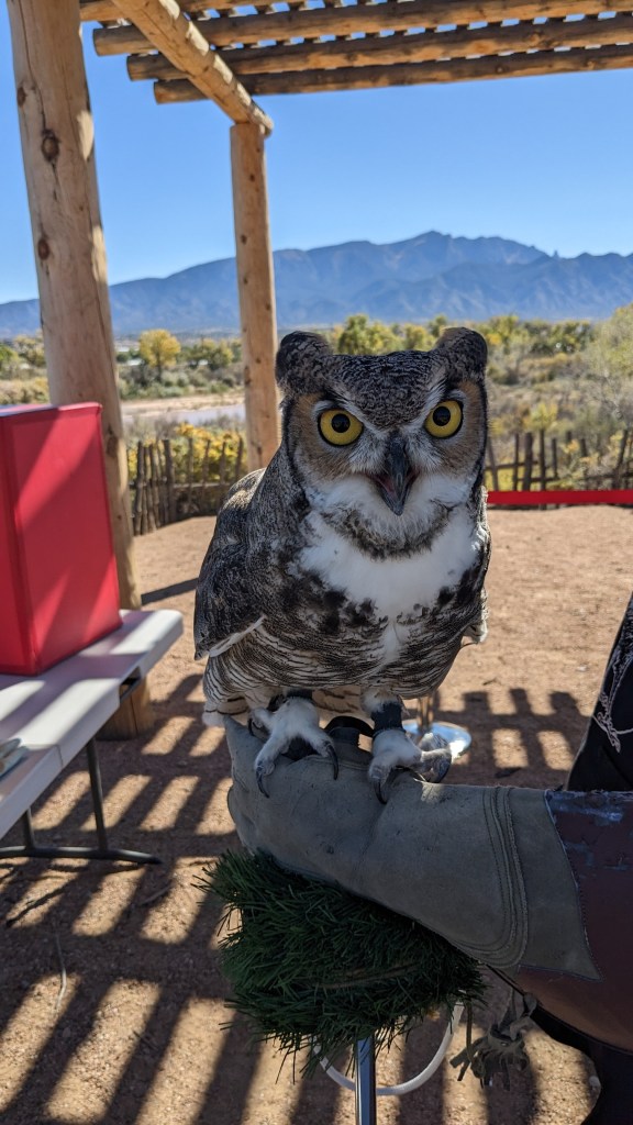 Inside the barn exhibit at Farm and Ranch And then yesterday I attended our Fiesta of Cultures event at Coronado and the weather was fantastic (but wnidy). Some of the ambassador animals that visited for the day were these owls and “Hector” the turkey. My deputy Matt raises turkeys (and Bob White Quail believe it or not) and he brings the animals around for people to enjoy and he donates the turkey feathers to local Indigenous artisans who make blankets out of them, it’s amazing how delicate and yet warm these blankets must have been.